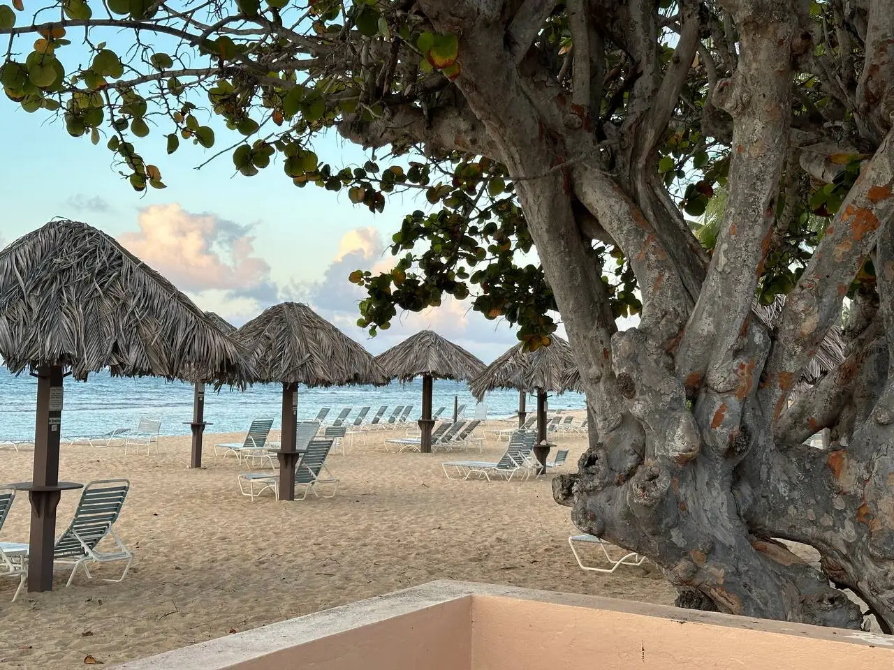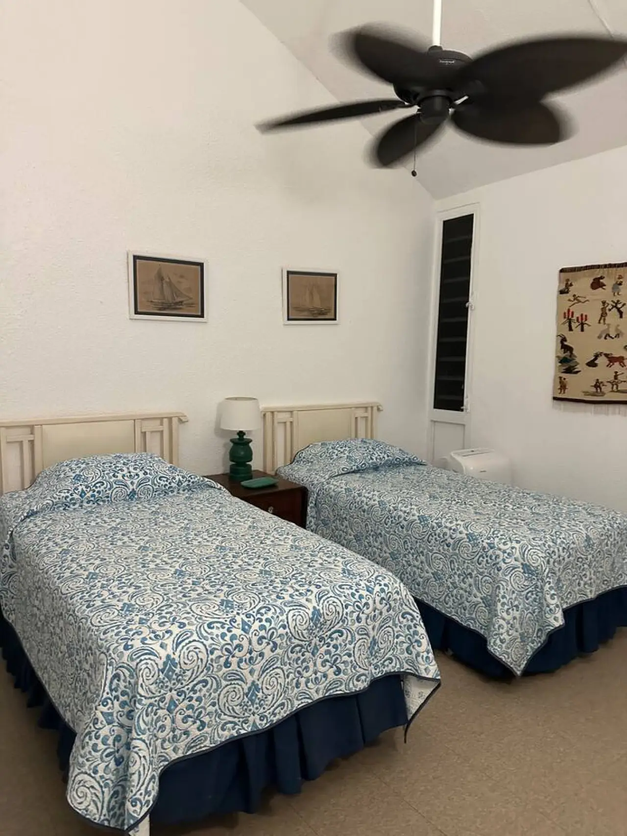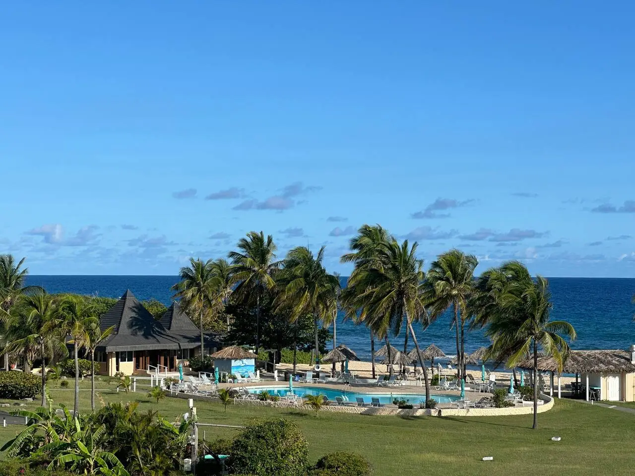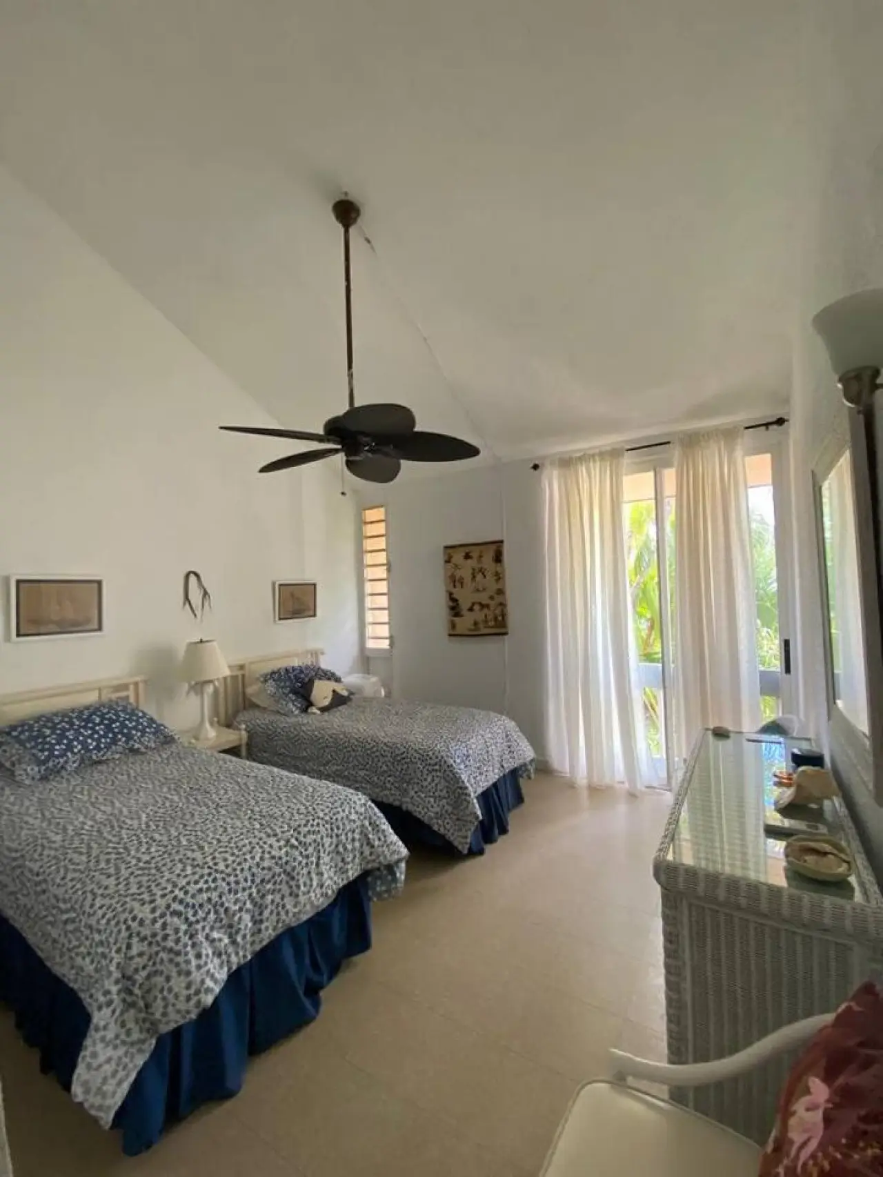 Step in and feel at home in our breezy beachfront condo, with one of the best views in the complex. It is charming, bright and spacious with everything you need for a fantastic family vacation or romantic retreat. Enjoy meals in the dining area or on the screened-in balcony. The kitchen has a brand new refrigerator and stove, new cutlery and new Lagustina cooking wear. Three private bedrooms with bathrooms, towels, linens, ceiling fan and air condition. First floor, seaside bedroom has a king bed and down the hall, roadside bedroom, has two twin beds. Upstairs loft has study area overlooking the living room, where there is a futon couch and patio facing roadside. Here you have a view of the hill and a line to hang your towels. The master bedroom has a queen size bed and private patio with breathtaking view of the sunset, grounds, beach, sea and stars at night. All bedrooms have ample closet space and a window AC unit.