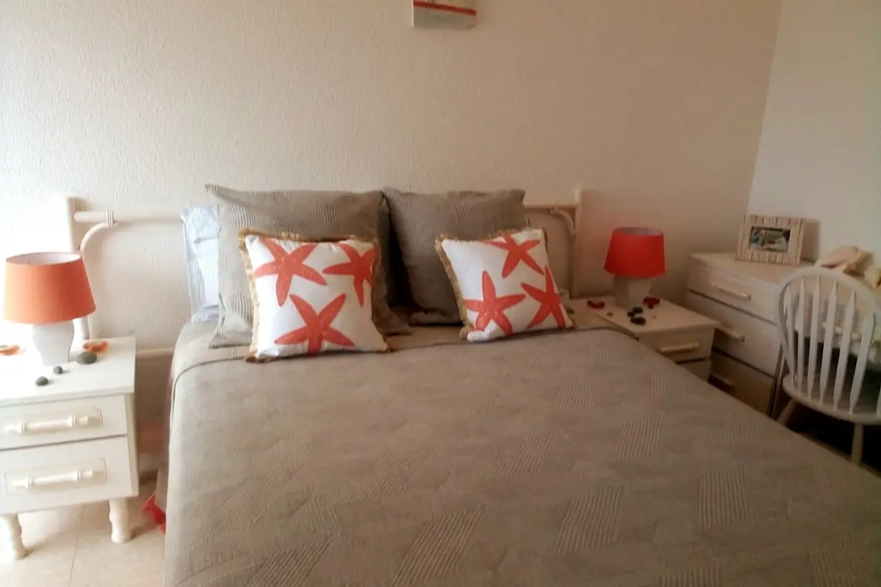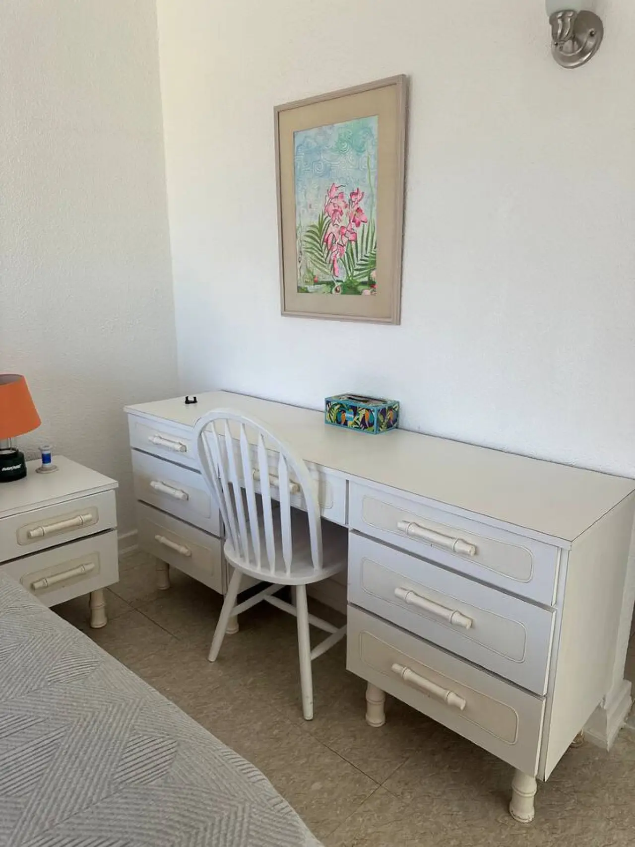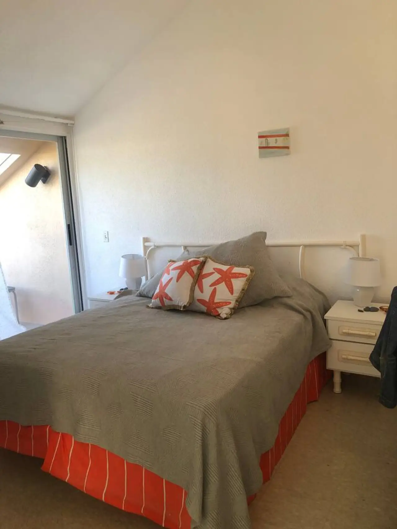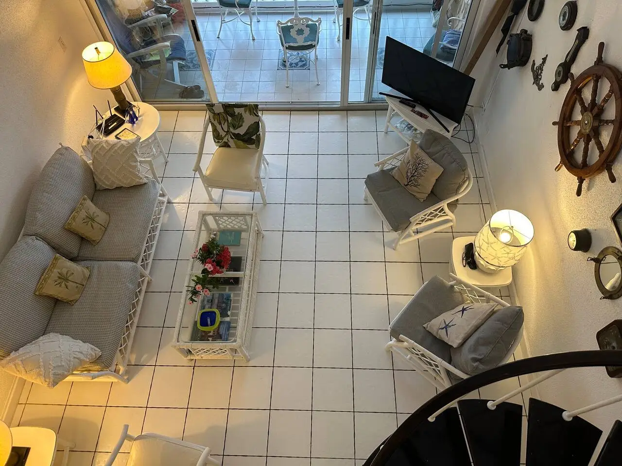 Step in and feel at home in our breezy beachfront condo, with one of the best views in the complex. It is charming, bright and spacious with everything you need for a fantastic family vacation or romantic retreat. Enjoy meals in the dining area or on the screened-in balcony. The kitchen has a brand new refrigerator and stove, new cutlery and new Lagustina cooking wear. Three private bedrooms with bathrooms, towels, linens, ceiling fan and air condition. First floor, seaside bedroom has a king bed and down the hall, roadside bedroom, has two twin beds. Upstairs loft has study area overlooking the living room, where there is a futon couch and patio facing roadside. Here you have a view of the hill and a line to hang your towels. The master bedroom has a queen size bed and private patio with breathtaking view of the sunset, grounds, beach, sea and stars at night. All bedrooms have ample closet space and a window AC unit.