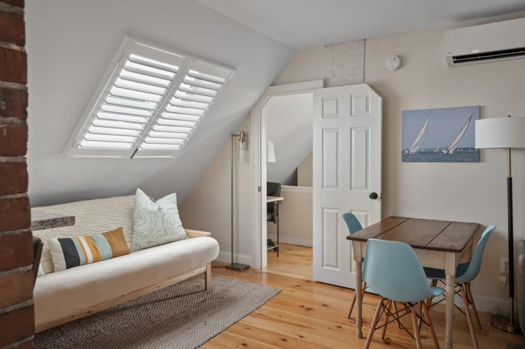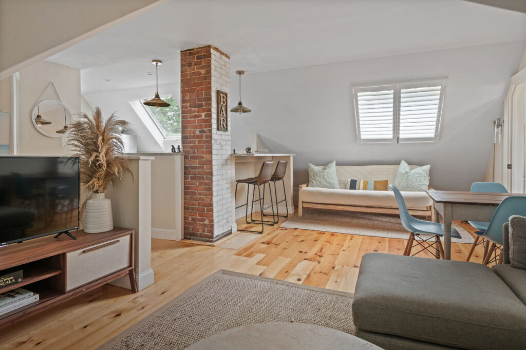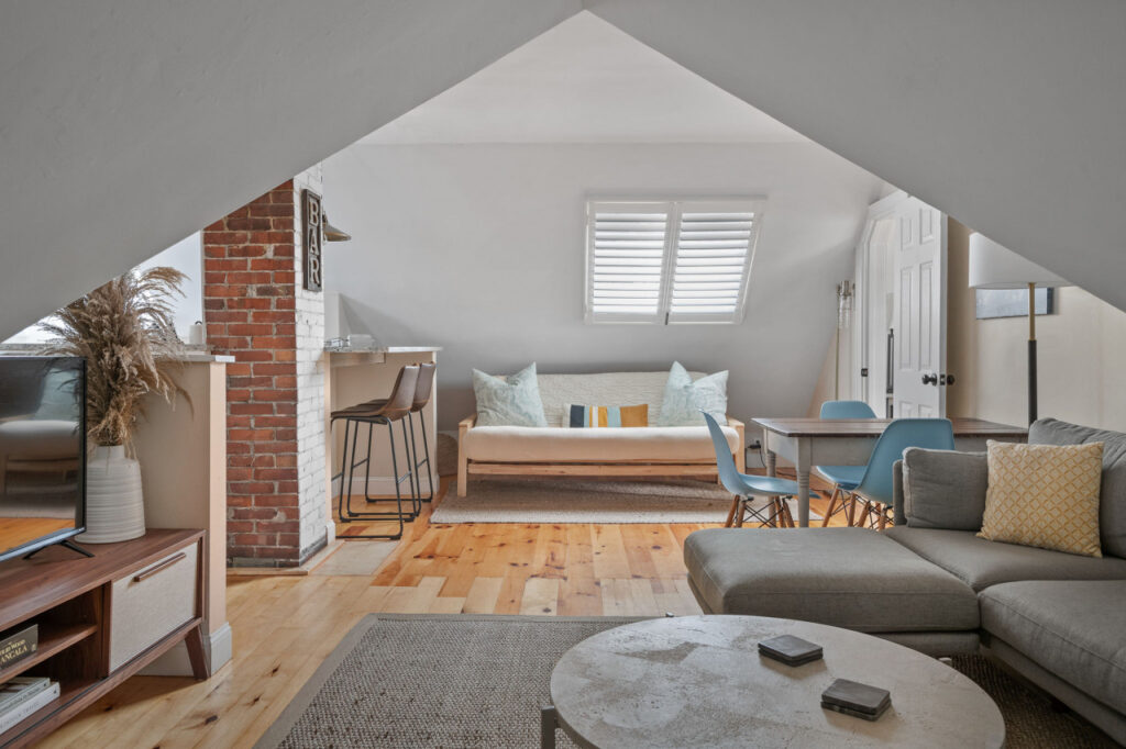 The sophisticated attached living area is a blend of style and comfort. You’ll find a thoughtfully curated space, with a comfortable couch and loveseat, futon, and dining area, nestled under large skylight windows that add to the apartment’s overall charm.