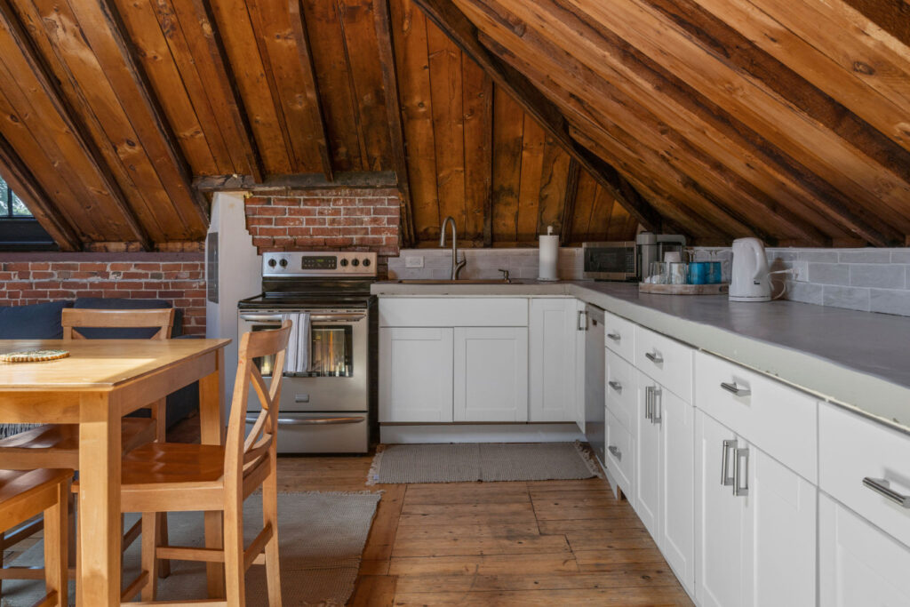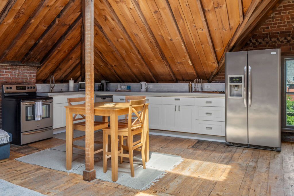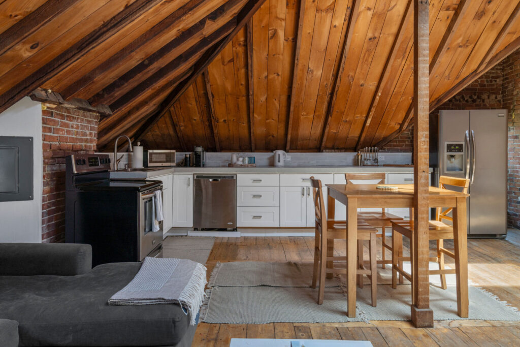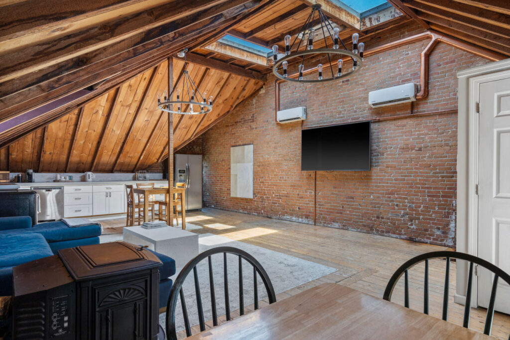 SPACE: This stunning 2-bedroom, 1.5-bath apartment effortlessly blends contemporary style with historic charm. The airy loft features cathedral ceilings, exposed beams, and skylights that drench the space in natural light. Enjoy an open-concept layout ideal for gatherings, a fully equipped gourmet kitchen, and spacious bedrooms with luxurious linens. The private rooftop deck provides breathtaking views of Portland’s skyline—ideal for sunset cocktails or stargazing.