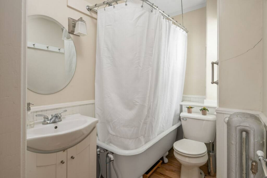 Also, space is a little tight in the bathroom. Width around the toilet is just a little more wide than a toilet. Also the tub is claw foot so requires stepping in and out.