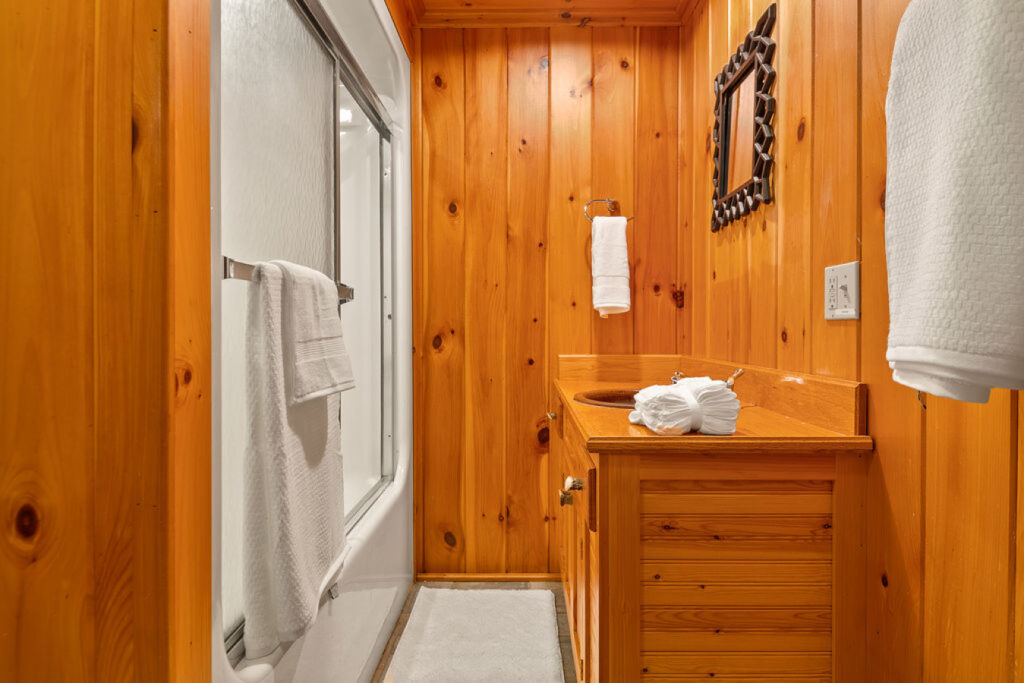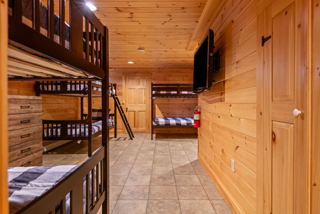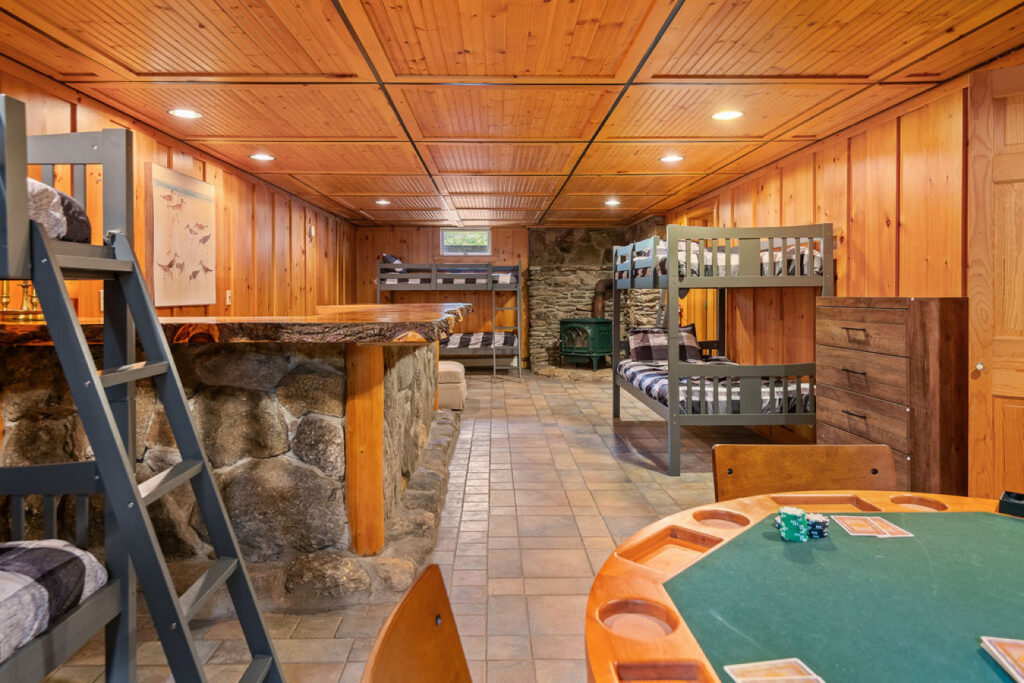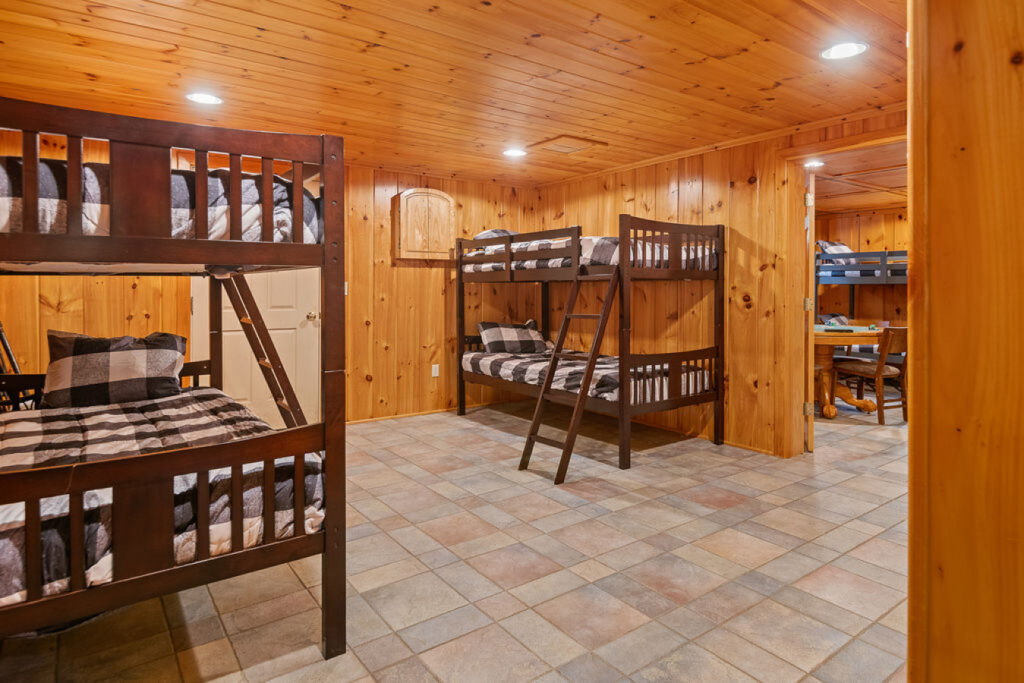 THE SPACE: Your private ranch-style retreat spans two distinct homes designed for gathering. Main House: a luxe king master suite, two queen bedrooms, one full bedroom, plus a show-stopping bunk room for 10 (five twin bunk sets). Guest House: three queen bedrooms and a 6-twin bunk room, plus its own full kitchen and two baths—ideal for extended families and multi-family trips. Shared perks include two full kitchens, comfy living rooms, and expansive dining areas that make feeding a crowd simple. Outside, enjoy private and exclusive use of the pool, volleyball & basketball courts, and wooded trails framed by ridgelines, fire pit, and treehouse—epic in winter snow and autumn color, refreshing all summer.